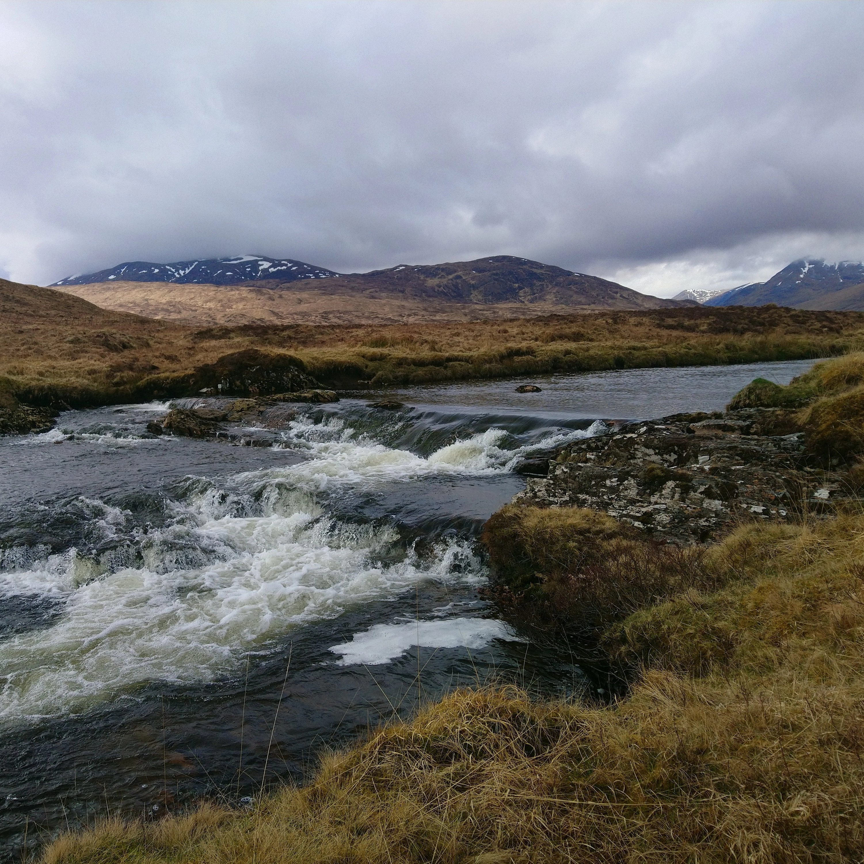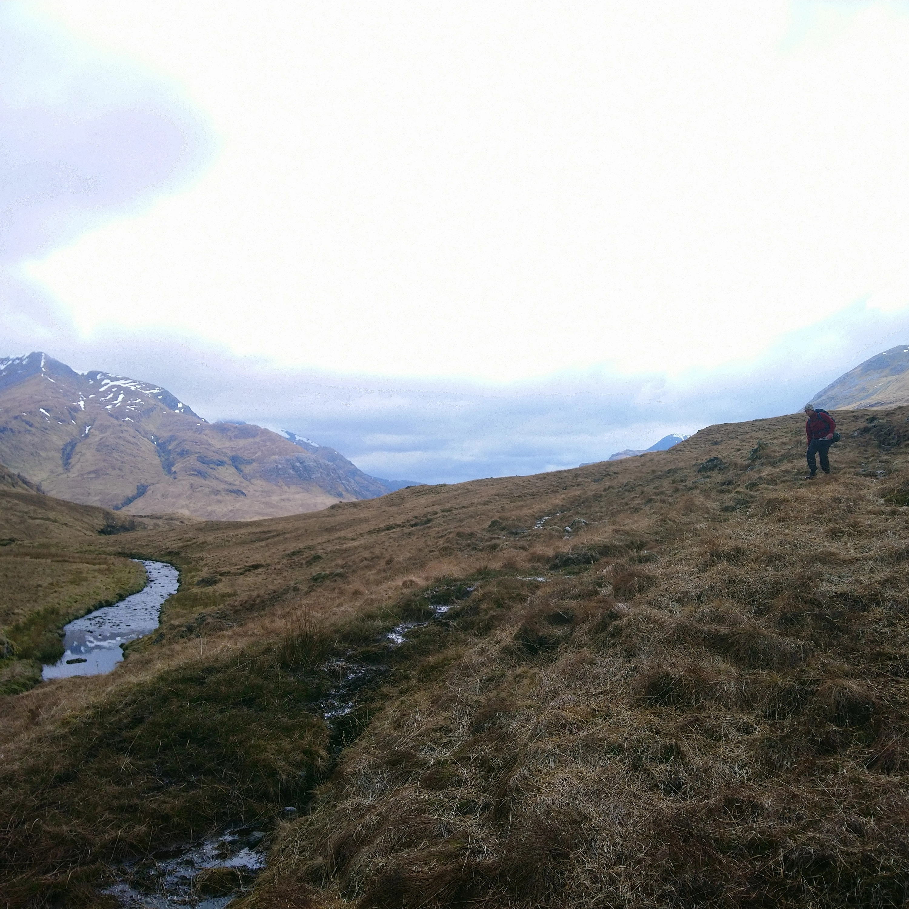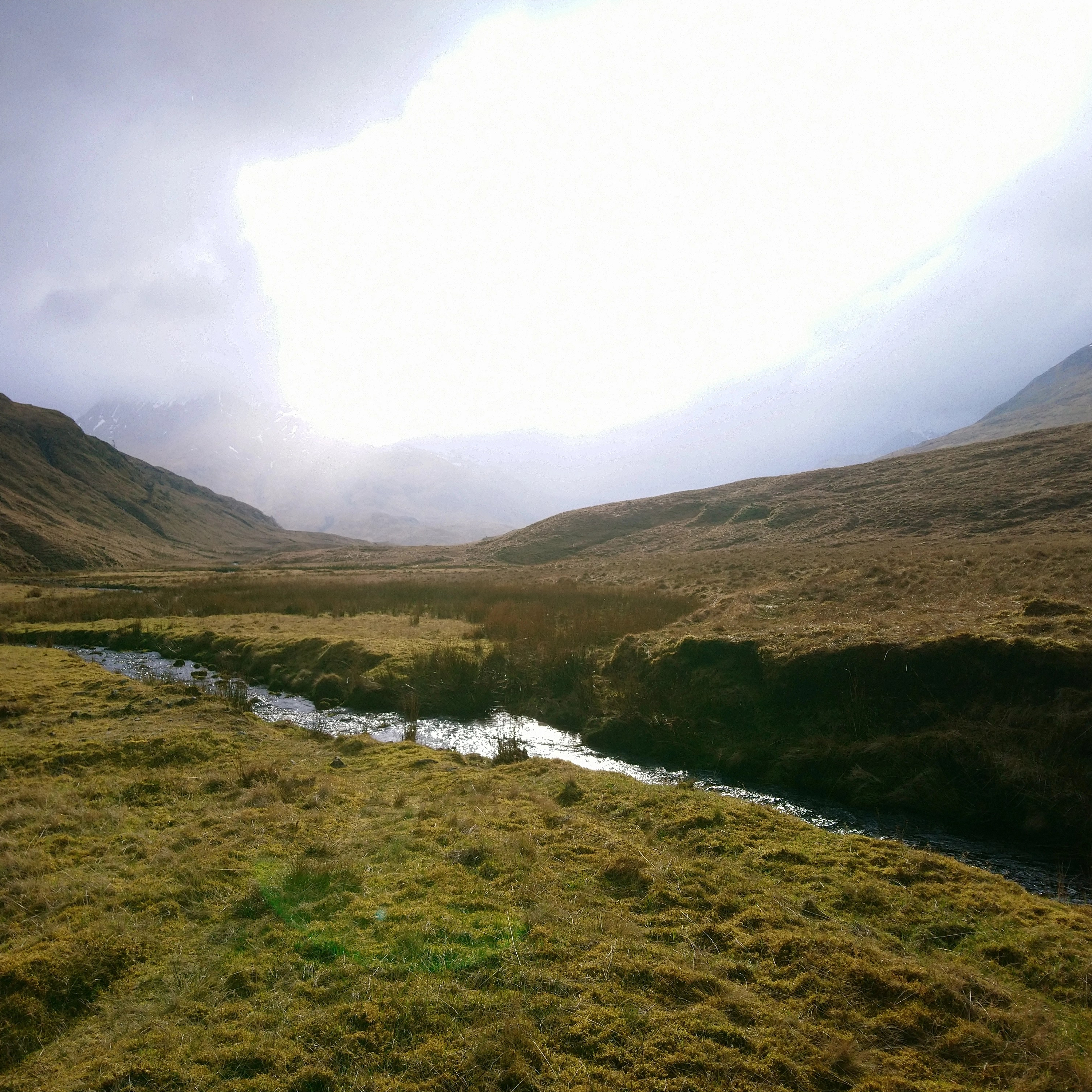 Trudging up the trail we passed crowds of people heading back to their cars but no one else in front or behind us going east, and once we had passed the great Steall falls we saw no one again at all that afternoon. The further we walked the thinner and wetter the trail grew, until eventually it fizzled out entirely and we were left slogging through bog and sedge and ankle-deep sphagnum. To make matters worse, Jack immediately discovered several large holes in his boots, and something strange happened to my eye which meant that I couldn't see further than 20 or 30 metres ahead of me for about an hour. Enthusiastic to the end, we kept on up the ascent toward a bend in the Abhainn Rath tumbling south down off the hills, which I forded, boots tied around my neck, while Jack walked further up in search of a narrow enough point to hop across.