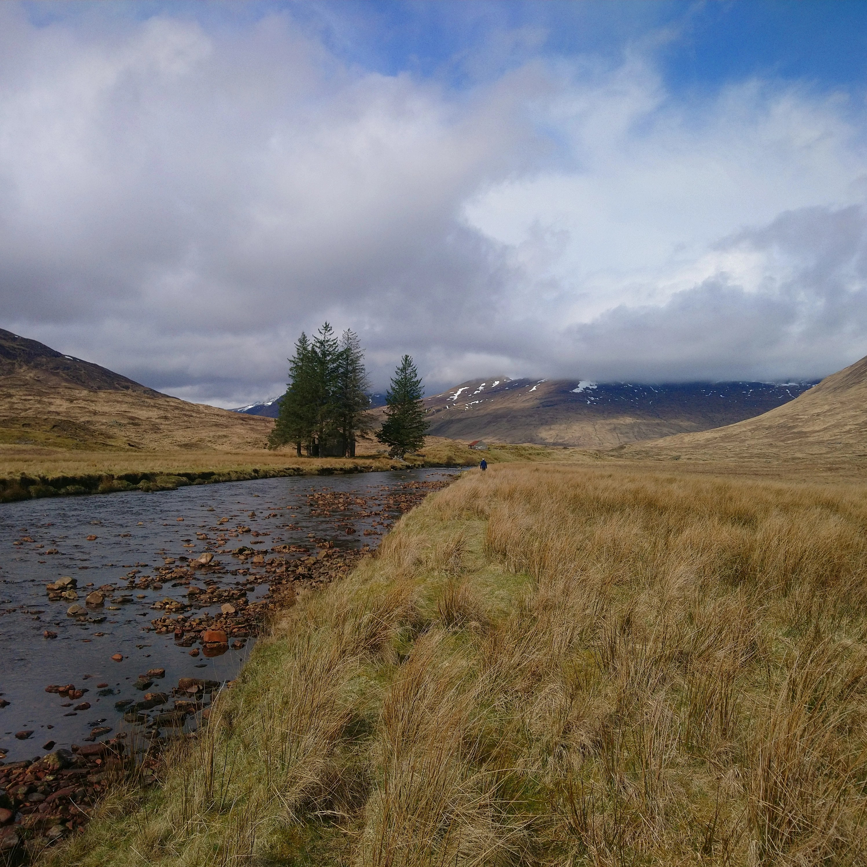 The next day we woke to find a chunk of our provisions gone and the neighbours next door already departed. We hadn't been robbed, but it was probably good that we weren't due to operate any heavy machinery. We took it slow, taking turns with the spoon again, this time to eat porridge, before dragging on our frozen walking clothes for the onward slog. The river was much wider here, and the ground less boggy so long as we followed its meandering bank. Blue sky peered down at us through the cloud.