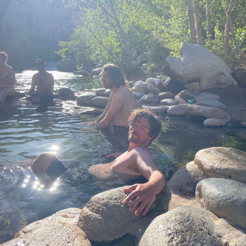 Thursday 23rd May (day 26) - Walked 13.9 trail miles plus a quarter-odd mile swam in the side quests. Woke late with a bad back, got on trail as quickly as possible. Met new friends and old crossing the river towards us in the morning. Got a great video and photos of a horned lizard digging a hole - to lay eggs perhaps? Funny creatures. Spent a while at a cool creek pool and spoke to other new friends before heading on to the famous Deep Creek hot springs. The springs surpassed all expectations and made for a fantastic afternoon, scalding hot in the smooth stone bowl before slithering out and over the rocks into the icy creek. Swam up and down enjoying the pull of the current and even climbed up to some inaccessible but majestic hot springs higher up in the rocks. Cowboy camped up on the hill and joked with Isaac and Skittle late, and in the process saw a Starlink satellite train going over, as well as what can I only be described as a UFO (none of us had any explanation for what this low, bright, silent craft was - vowed to not dwell on it lest I get into conspiracy theories).