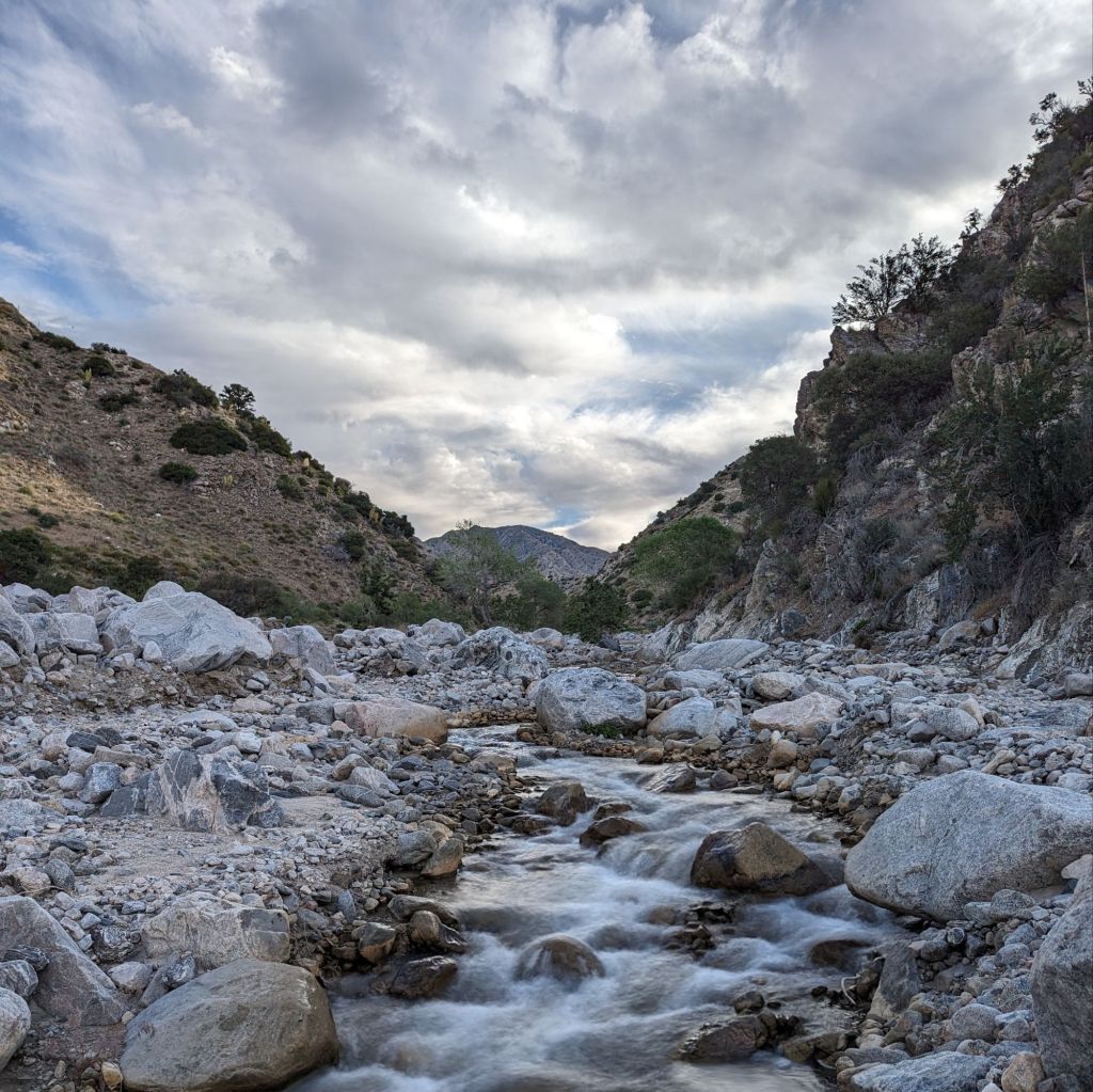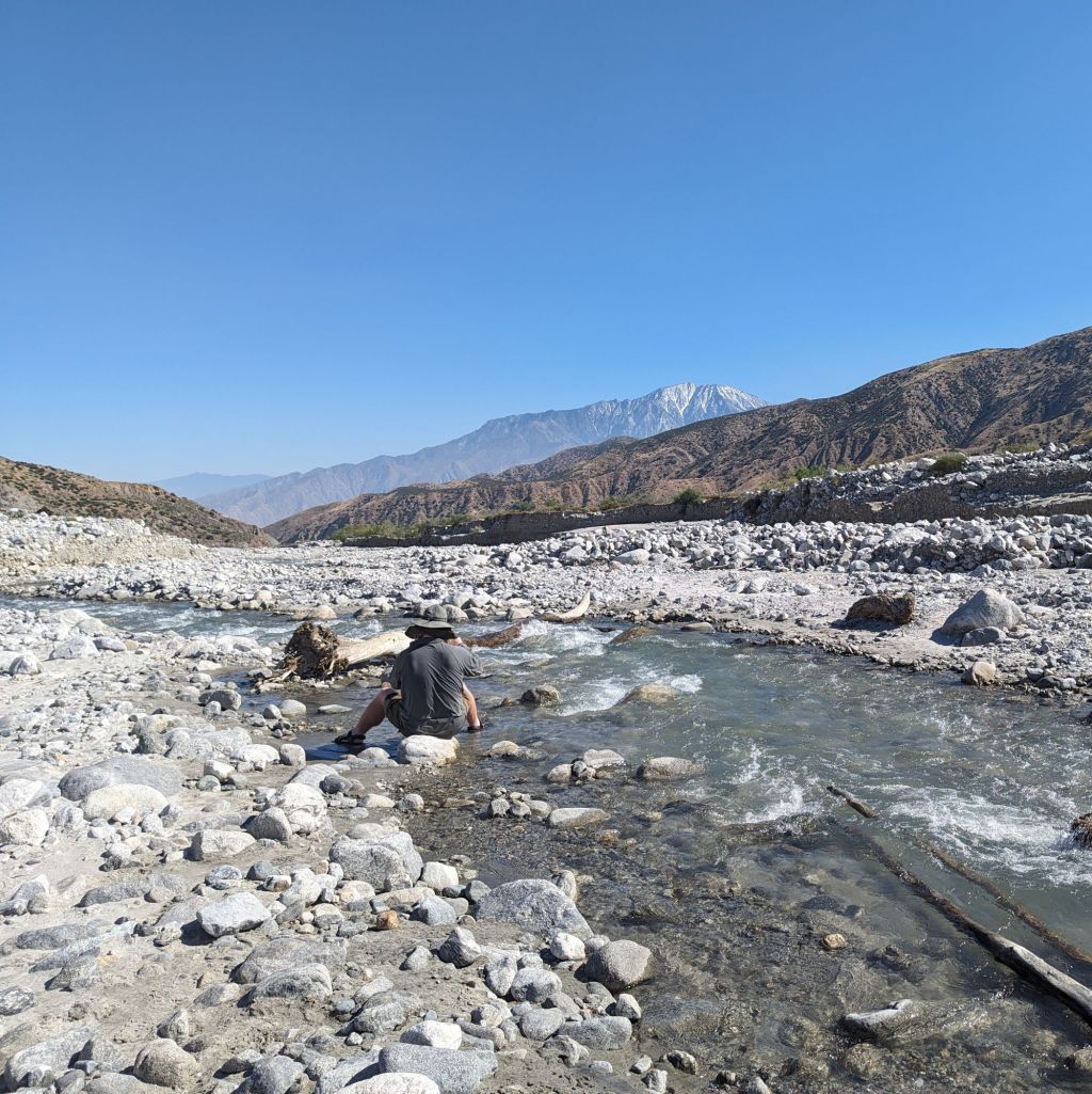 Friday 17th May (day 20) - Walked 7.6 trail miles. Slept much better. The draw of the Whitewater Preserve was so strong that we ended up staying well into the afternoon, taking advantage of the power outlets, flushing toilets, and bathing pools. Headed off around 2:30pm and cowboy camped on the banks of another huge gravel stream - Mission Creek.