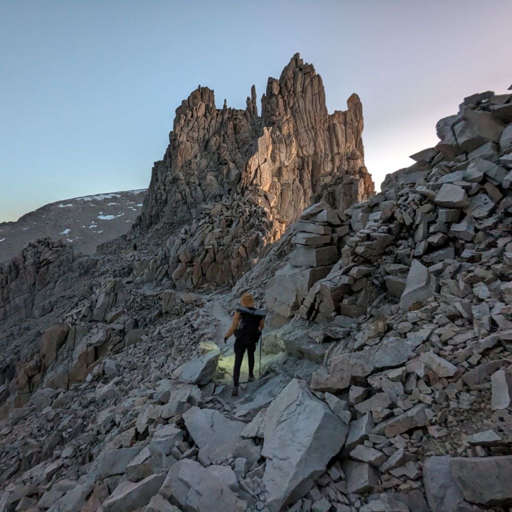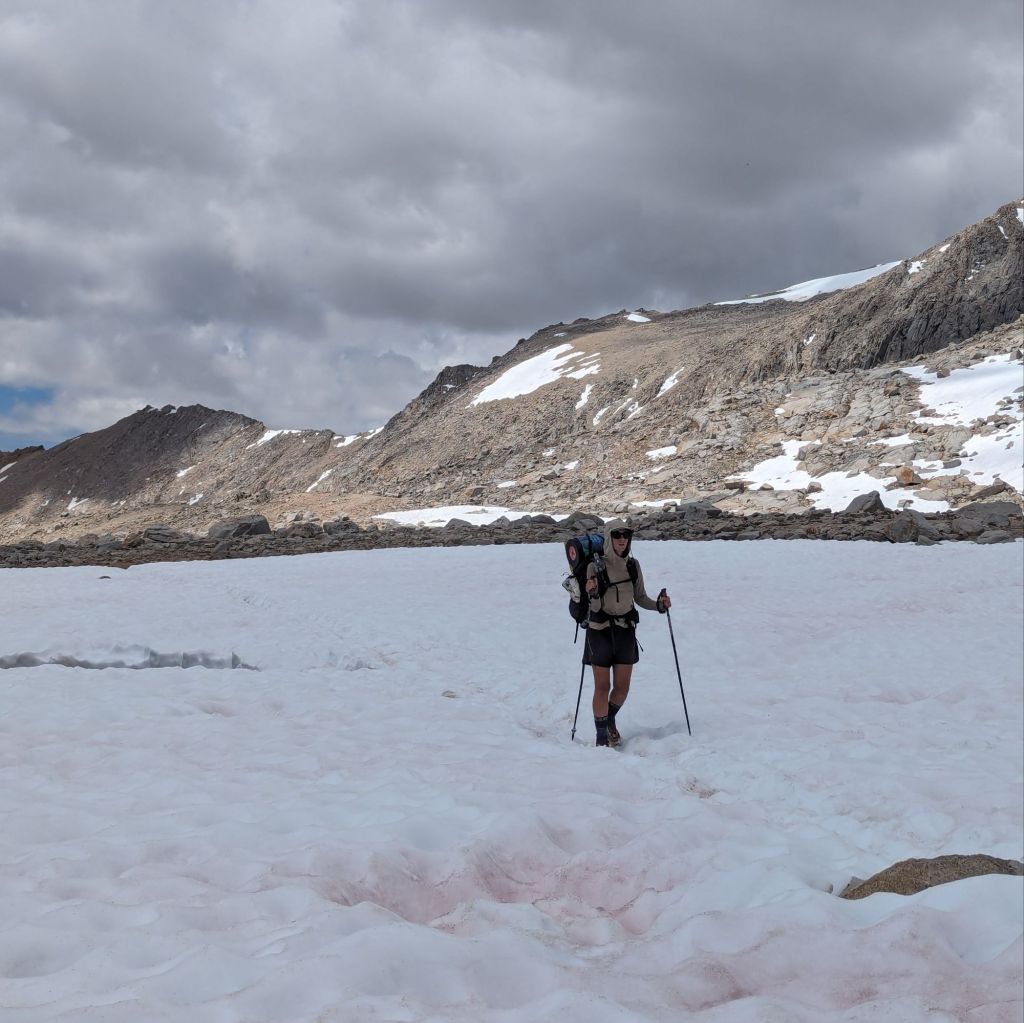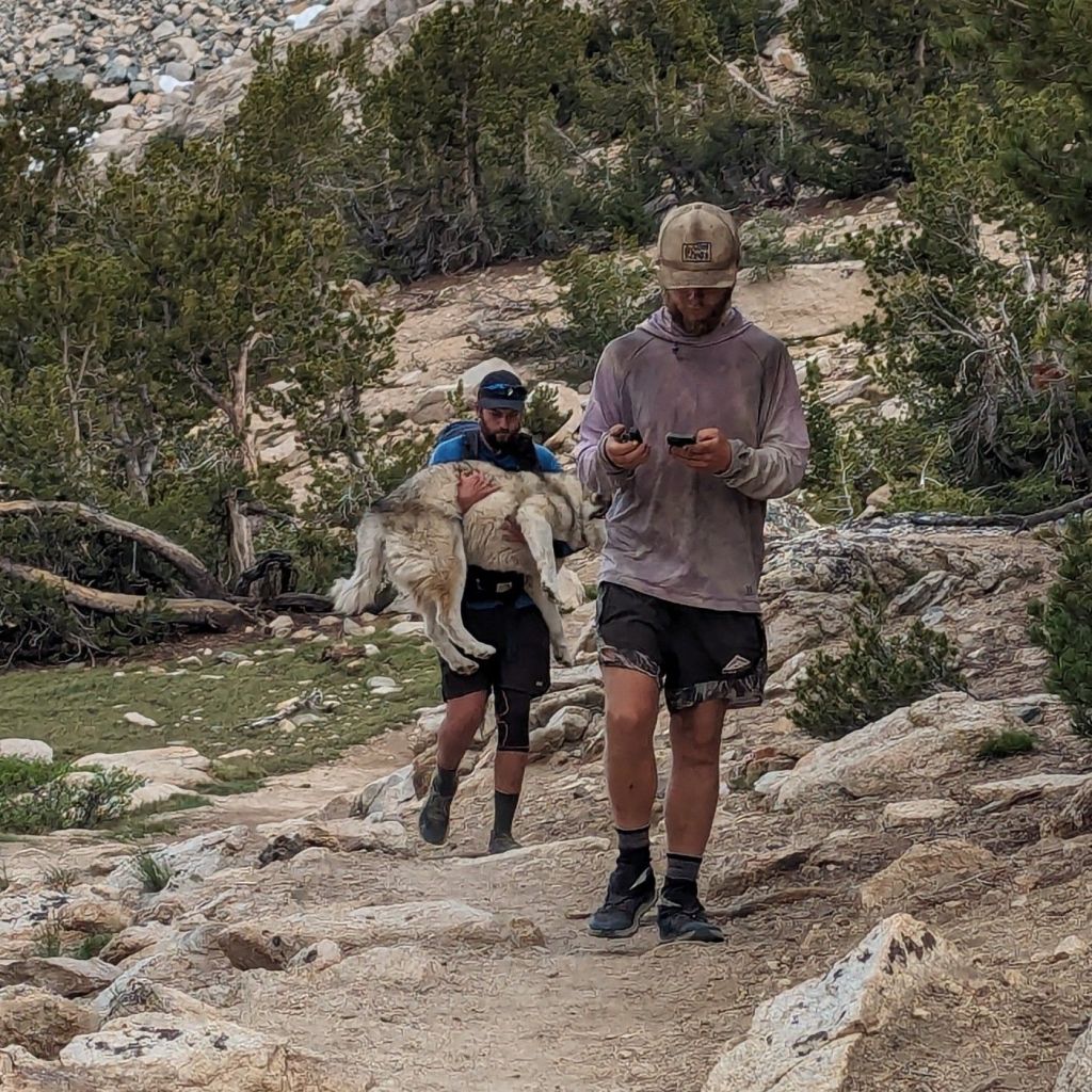 Steaming up towards Kearsarge Pass on the final morning, after a miserable.night in which we ran out of both gas and food, Grace and I bumped into Big Shrimpin' in the middle of hitting his Garmin satellite SOS button.