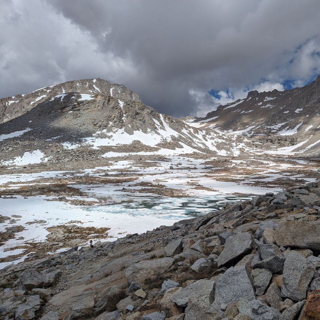 Climbing ever higher, the landscape opened up yet again, and eventually we reached a snow field completely covering what remained of the approach in two feet of ice. We passed alpine tarns with ice still floating in them, and eventually even the marmots disappeared. The sky clouded over for the first time in months.