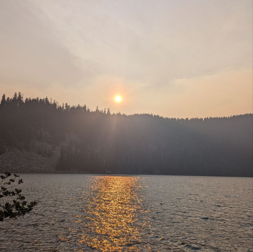 Shaggy gave us a ride the next day. It was hot, even with the AC up in the car, and when we got to the tiny Shelter Cove resort the air was thick with smoke. Looking out over Odell Lake I could barely see the mountains on the opposite shore. We sat out the worst of the heat there and got our packs ready to go, having cobbled together a pretty poor resupply from gas stations and fishing tackle store along the way.
