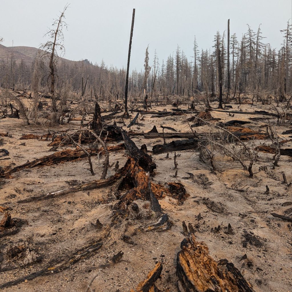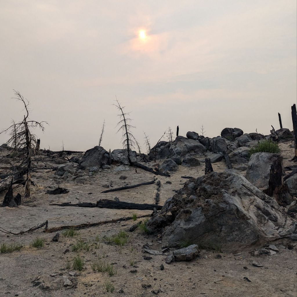 The worst of the ashtray section lasted about five miles. For two hours I walked through that barren landscape. The burn was so absolute that much of the wood had simply disappeared, and rather than picking our way through treacherous blowdowns we found the path wide open for us. It was unique, in that the monochrome landscape was not even dotted with the new life of wildflowers, yellow and pink flourishes among the brown and black, either because the burn had been so bad or so recent that nothing could now live in that desolation. When we did reach the green of some only-partially-burned and perhaps-still-living forest, it was a close and huddled scene set against an orange sky.